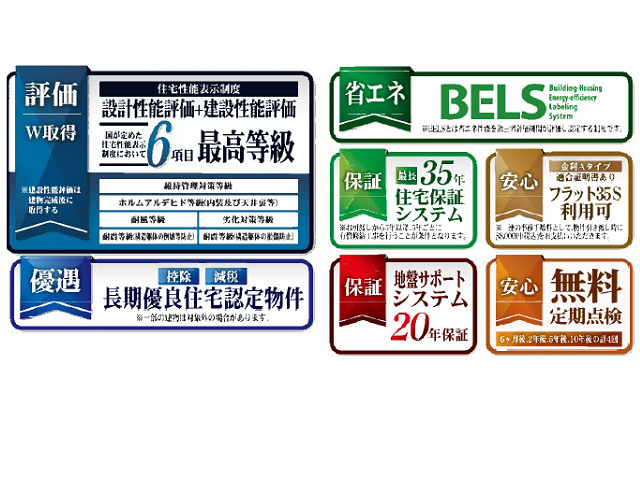 東京電力・公営水道・本下水、耐震等級3級(最高等級)、都市ガス、住宅性能評価書取得、10年保証付き,バリアフリー、フラット35利用可、2階建、駐車スペース2台可(車種による)、4LDK(3SLDK)、LDK17帖超 |