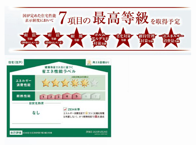 東京電力・公営水道・本下水、耐震等級3級(最高等級)、都市ガス、住宅性能評価書取得、2階建、10年保証付き,バリアフリー、フラット35利用可、LDK18.37帖超 |