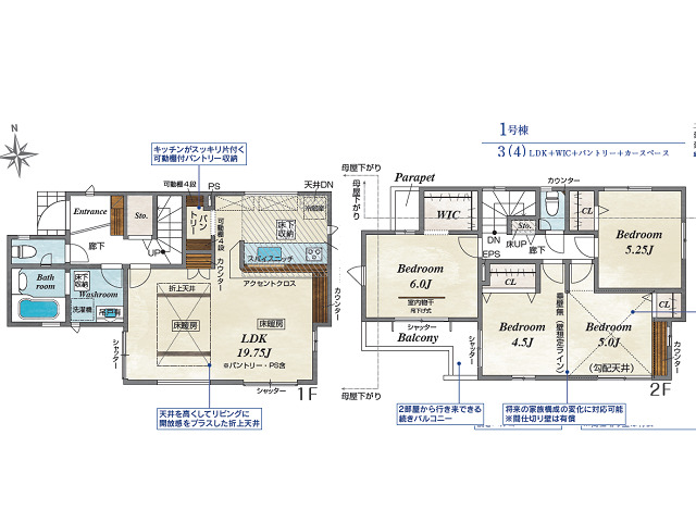 4LDK(3SLDK)、フラット35利用可、10年保証付き,バリアフリー、都市ガス、東京電力・公営水道・本下水、耐震等級3級(最高等級)、住宅性能評価書取得、2階建、LDK19帖超 |