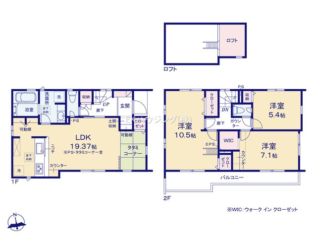 東京電力・公営水道・本下水、耐震等級3級(最高等級)、都市ガス、住宅性能評価書取得、フラット35利用可、LDK19.37帖、2階建、駐車スペース2台可(車種による)、完成物件 |
